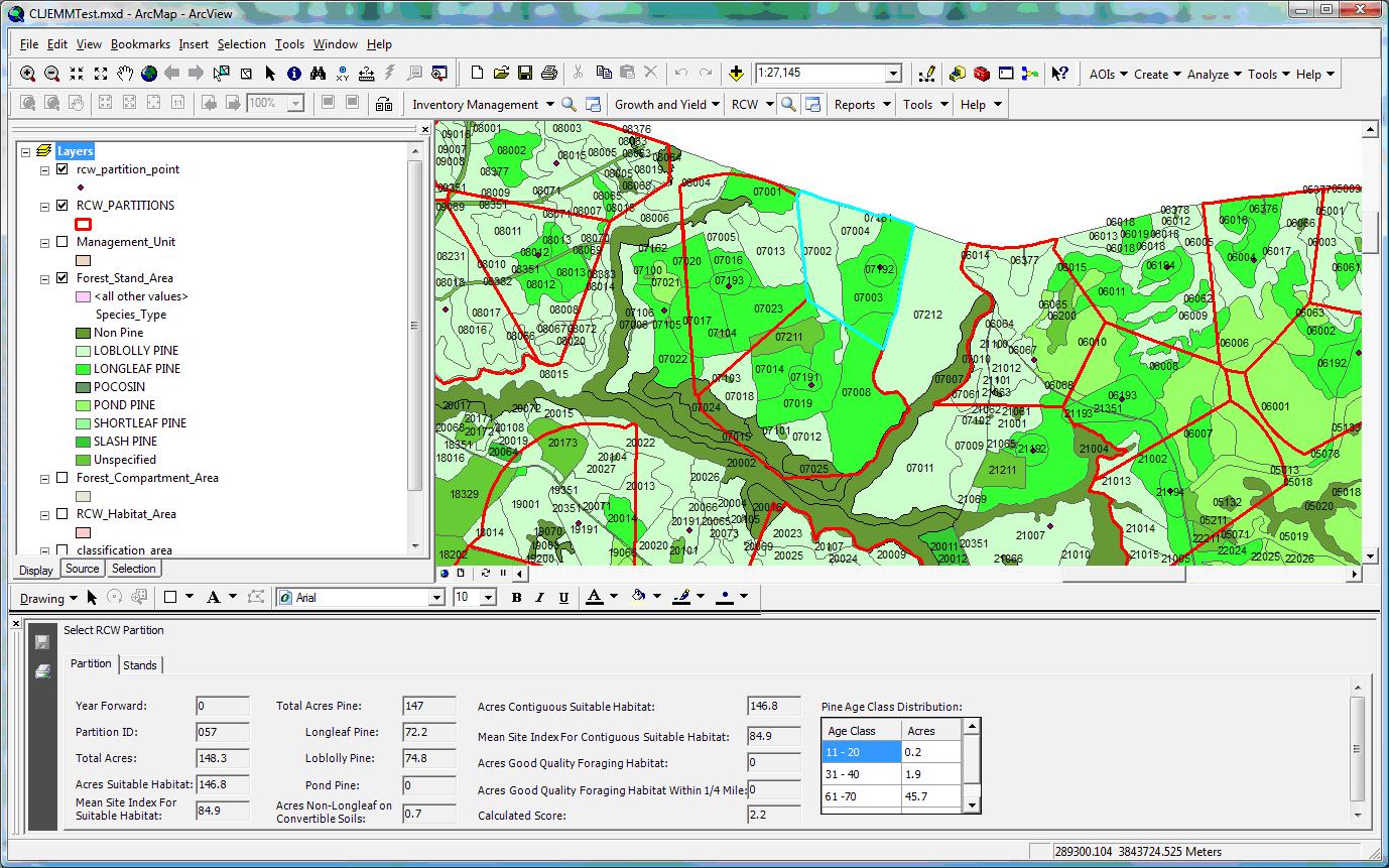 This project involved software development and maintenance for an ecosystem management model using ArcMap, SQL Server, SDE, and VB.NET. The application predicts future land conditions based on user specified management strategies. Future conditions are reported in a variety of formats including text, graphs, maps, and pictures. Tools have been created that allow the user to interactively specify the management strategy for a particular management unit. The application integrates Forest Vegetation Simulator (FVS) to predict future forest conditions based on management actions. A tool within the application analyzes and rates forest stands for Red Cockaded Woodpecker habitat suitability. Stands are analyzed within a buffer distance surrounding known nesting colonies of this endangered species. Contiguous habitat areas are calculated based on a minimum distance between stands with suitable habitat. Kingbird Software provided software development services for this project.